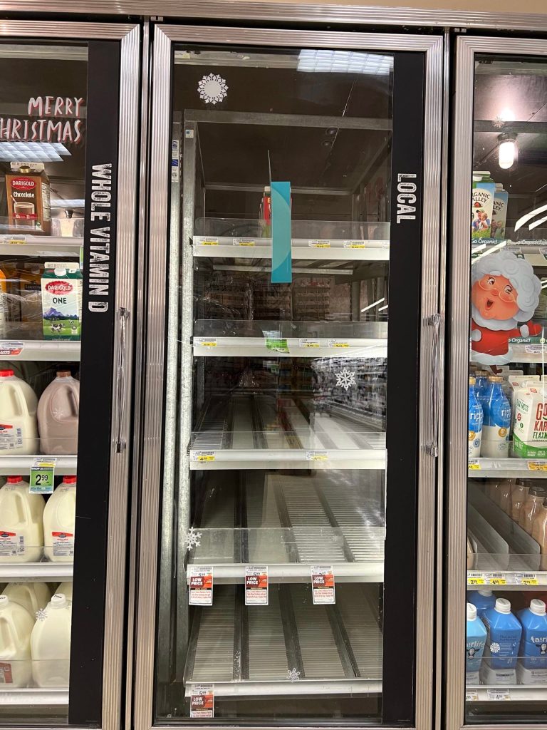 Throughout the store, the weather threat could be seen by the presence of salt and mud stains on the floor of every aisle. Certain sections of food were empty. Bread stock was low, and certain dairy and baking products were gone as shoppers quickly grabbed what they needed and left.