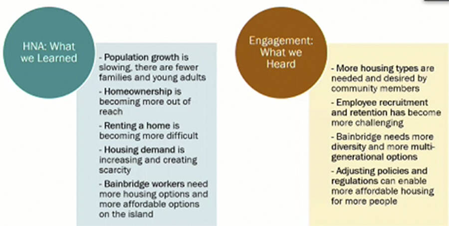 Morgan Shook and Jennifer Cannon of ECONorthwest explained the framework for the city’s Housing Action Plan. It heard through public input that more affordable and diverse types of housing are needed as people who work on BI can’t afford to live here, and commuting increases greenhouse gases, which is against climate goals of city leaders. It also heard that more diversity is desired on BI, there are fewer families and young adults, and renting is difficult and home ownership is out of reach.