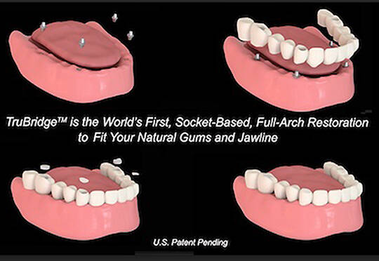 Called TruBridge, the ultra-light, zirconia-strong, teeth-only upper and lower arches have been designed at a fraction of the weight and cost to fit comfortably into the original sockets in the mouth’s natural gumline. TruBridge does not require invasive drilling or removal of the jawbone or gums as heavy acrylic devices and dentures have imposed on patients for decades.