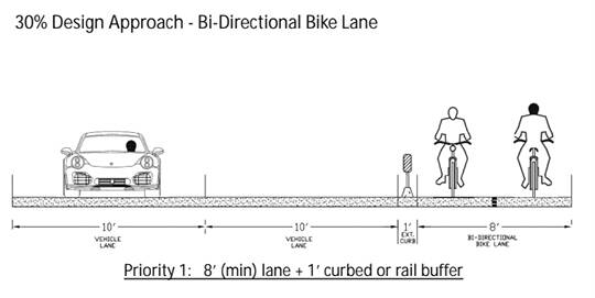 According to a survey, 68% like the bi-directional lane on one side as long as it has a physical barrier and can be 8-10 feet wide.
