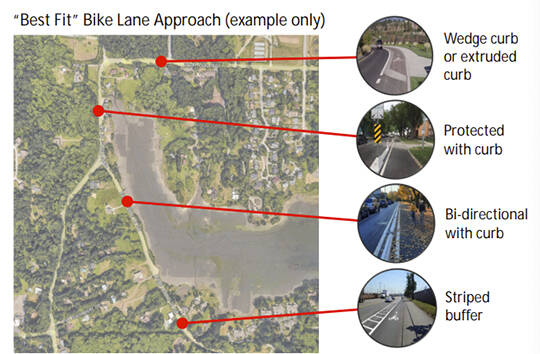 The “best fit” approach could include a striped lane, striped with buffer, striped with buffer and flex barrier, green painted bike lane, bike lanes with raised wedge curbs or bike lanes with a regular raised curb.