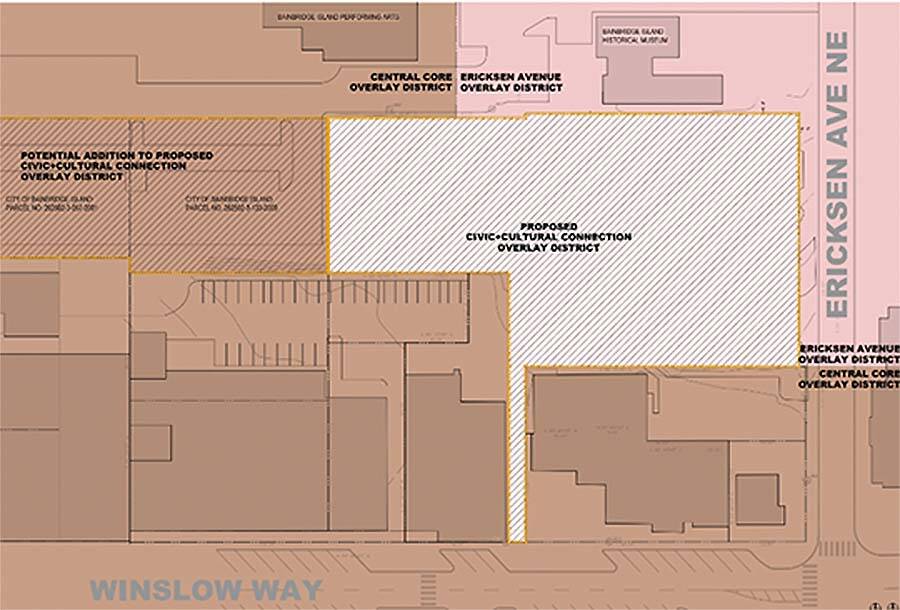 The project would have created an open walkway and park-like corridor from Winslow Way up to City Hall and the BI Performing Arts building, alongside the museum. It also would have had five- and four-story buildings for mixed business and residential use, both including market and affordable housing units.