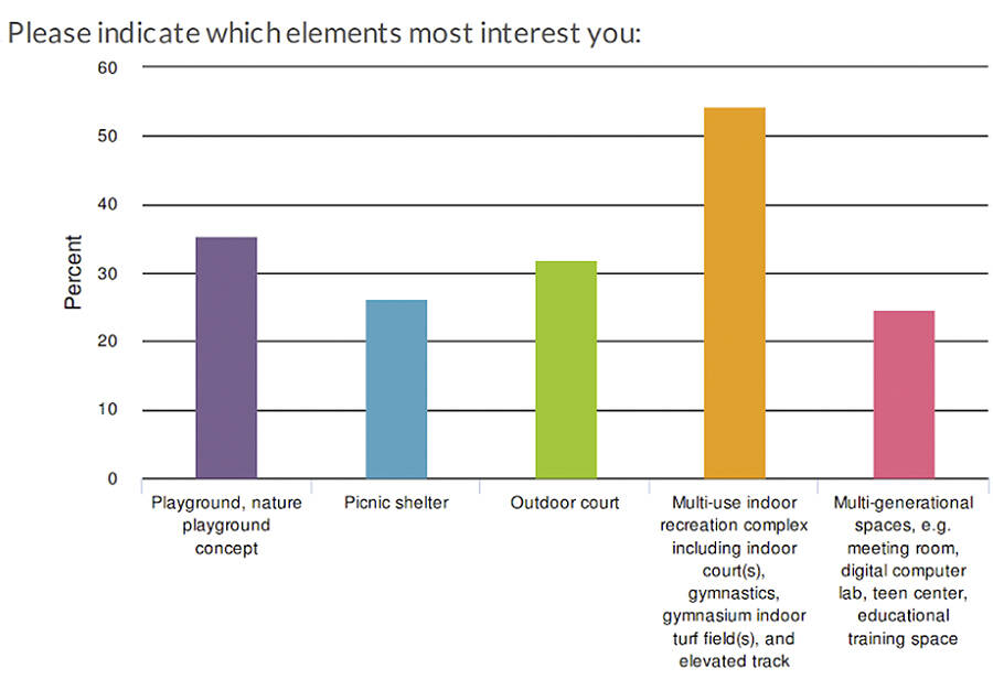 A survey shows 55% want an indoor facility, 45% a playground, 32% outdoor court, 26% picnic with shelter and 24% meeting rooms.
