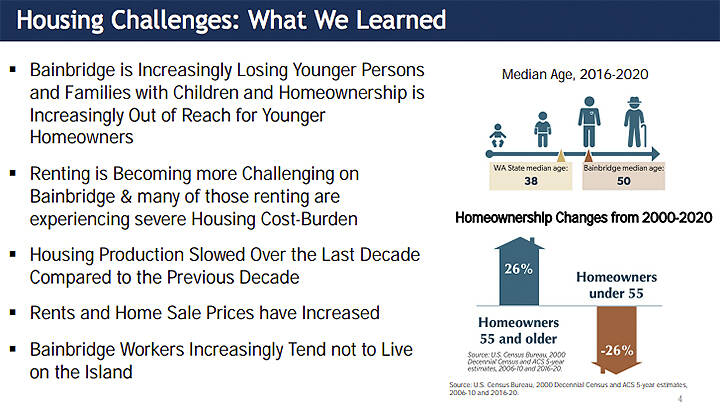 The presentation continues saying BI is losing young people as home ownership is out of reach. Many who work here can’t afford to live here. Renting also is challenging. Housing production has slowed, and prices have risen. It also says seniors are struggling to stay on BI because rising housing prices mean higher taxes. It’s also hard for them to downsize due to a lack of housing.