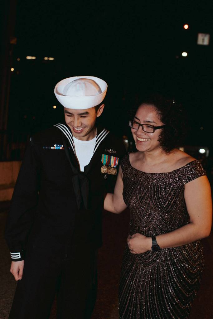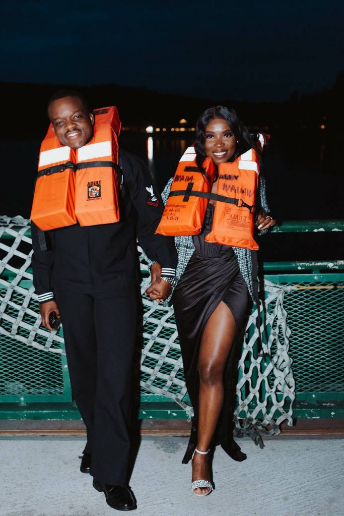 In all, Jezak recalled doing about nine photo shoots that night with a number of officers and couples headed to the ball among other passengers aboard the ferry. The combination of the setting, the night sky and the flair of the passengers made for some heart-warming pictures. One couple even had some fun with the inconvenience, posing with bright-orange life jackets for some of the photos.