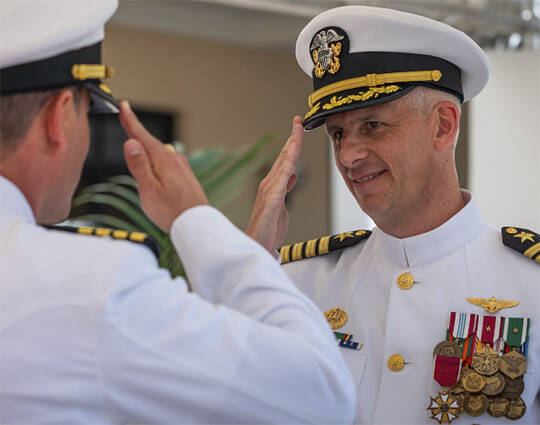 Capt. John Randazzo relieved Capt. James Stewart of Suquamish as commanding officer of NSA Naples, Italy. The ceremony featured Rear Adm. Brad Collins, commander, Navy Region Europe, Africa, Central. Collins praised Stewart, saying, “You have deftly, like a skilled statesman, balanced the breadth and depth of priorities to keep this installation running at peak performance.”