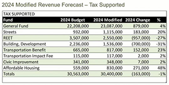 The biggest changes come from: Winslow Subarea professional services, $201,200; water and sewer operation changes, $350,000; Sound to Olympic Trail grant, $1.7 million; Ted Spearman carbon offset program, $780,000; electric charging station, $160,000; Springbrook fish passage, $959,000; Country Club bulkhead, $250,000; Winslow supply well, $208,000; sewer treatment plan upgrades, $1.423 million; sewer treatment outfall extension, $700,000; Wing Point pump station, $648,000; previously approved changes, $492,000; and transfer to building, development and services fund, $561,500.