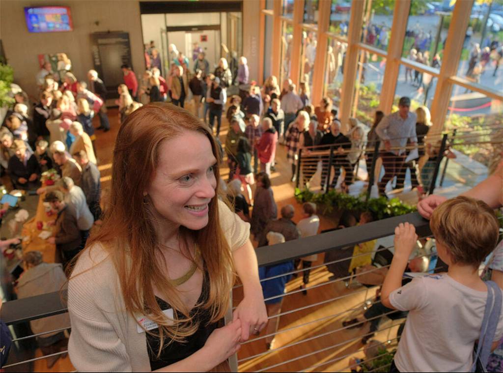 Matt Longmire, communications and development coordinator, waits for the crowd to arrive in the huge and beautiful lobby area.