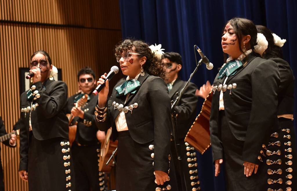Dressed in black charro costumes and Dia de los Muertos (Day of the Dead) face makeup, the musicians played a repertoire of songs with guitar; guitarron; vihuela, a 19th-century, five-string, guitar-like instrument; trumpet; and harp.