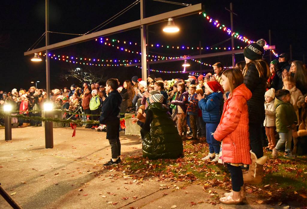 A crowd of people young and old watches the events of the tree-lighting ceremony.