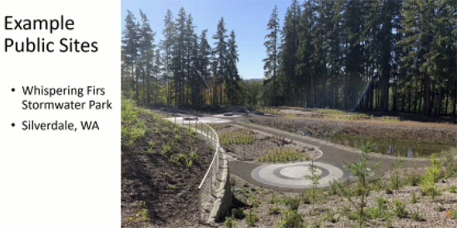 To recover streamflow, city papers say runoff needs to be mitigated on private property from roofs, driveways and lawns, along with on public property like roads and farmlands. A park at a cost of up to $1 million is one mitigation technique. As an example, the city showed a slide in a presentation of such a park in Silverdale that deals with 80 acres of runoff.