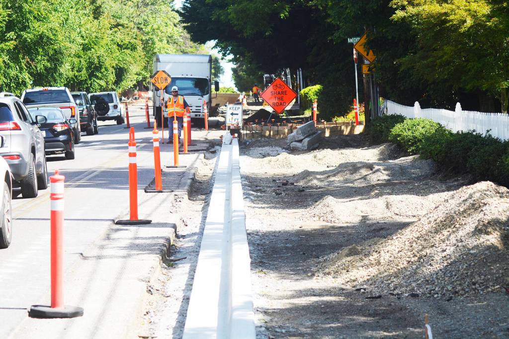 It’s summertime, officially it will be June 20, and that means construction time on Bainbridge Island and elsewhere. At left, framing goes up on an affordable housing development on Madison Avenue. Nearby, crews build a curb along Madison. That work will also include improved bicycle lanes. Motorists are advised to be cautious as construction work is taking place all over BI.