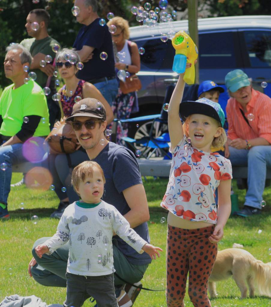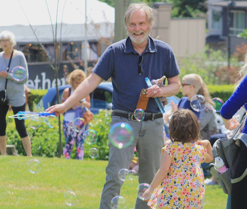 Bubble organizer Gerald Simonsen, who lives across from Winslow Green, said that he bought a bubble machine during COVID and would blow bubbles from his balcony. It seemed to make people happy, he said, which gave him an idea: Bainbridge Bubble Day.