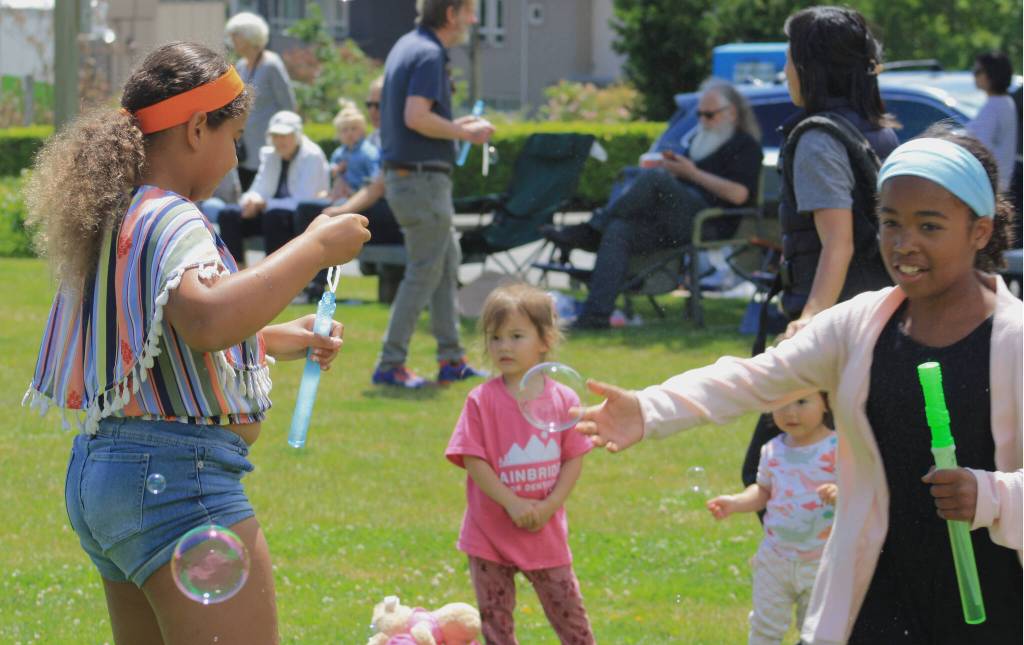 About 70 people of all ages brought bubble wands, machines and more to the Winslow Green, and enjoyed the sunshine while the youth ensemble from Steel Dragons played songs like “Walkin’ on Sunshine” by Katrina and the Waves, “Africa” by Toto, “Jump in the Line” by Harry Belafonte and more. A few businesses along Winslow ran bubble machines as well.