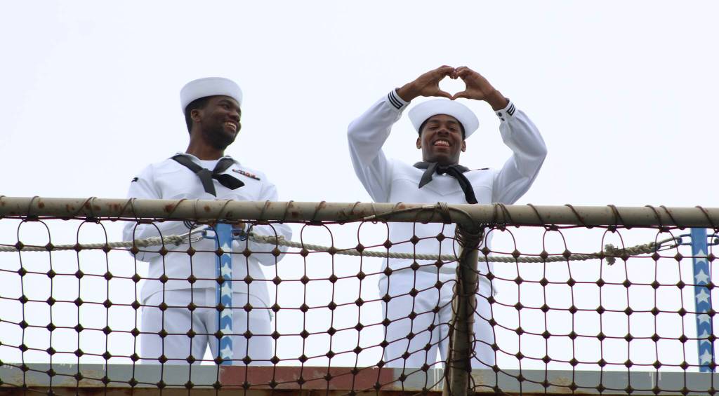 Eagerly waiting were hundreds of family members ready to greet their relatives to their new home, waving miniature US flags and displaying handcrafted signs either premade or decorated on base a while earlier. Occasionally, the cry of a name as a sailor’s face became recognizable was followed by cheers from the crowd.