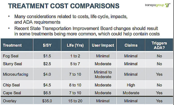 A report introducing the topic says the city takes care of 287 miles of roads, which includes paving, patching, pothole repair, sweeping, shoulder and gravel road grading, and vegetation control. Historically, $500,000 a year was spent, but that was increased to $1 million. The council was told preserving good roads can be 10 times cheaper than reconstructing failed roads. It looked at treatment examples and costs including: Chip seal, slurry seal, fog seal, cape seal and micro surfacing.