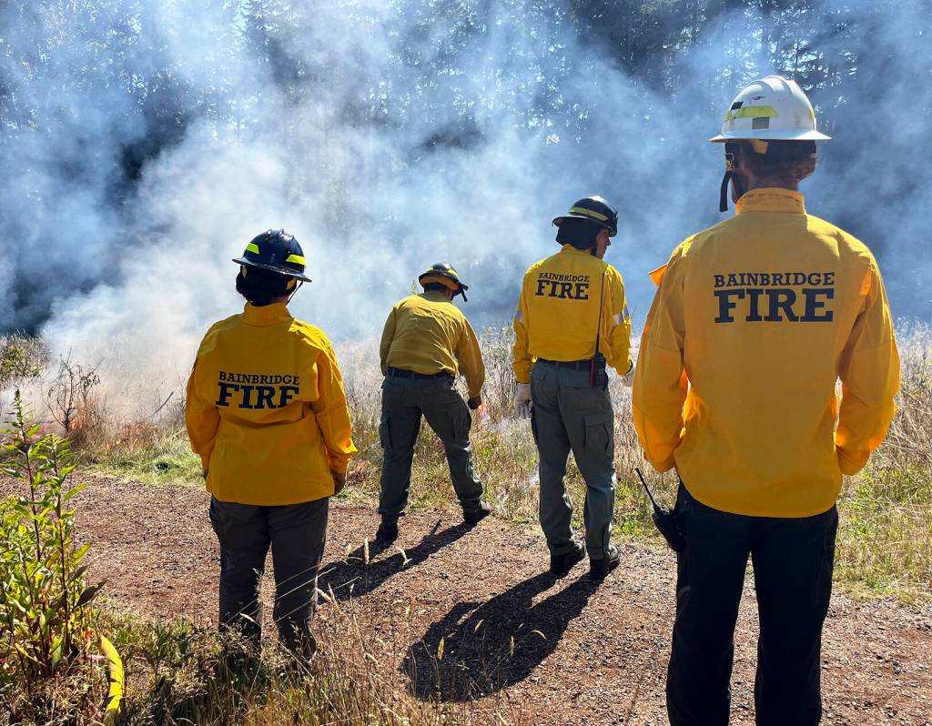 Two of the firefighters had been recently deployed to Yakima. One shared a video from the front lines: a roaring wall of fire and ash consuming mature conifers over 40 feet tall. Treating forested areas on BI is “just a dream at this point,” Morevac said. For now, it’s cold burns in open areas only.