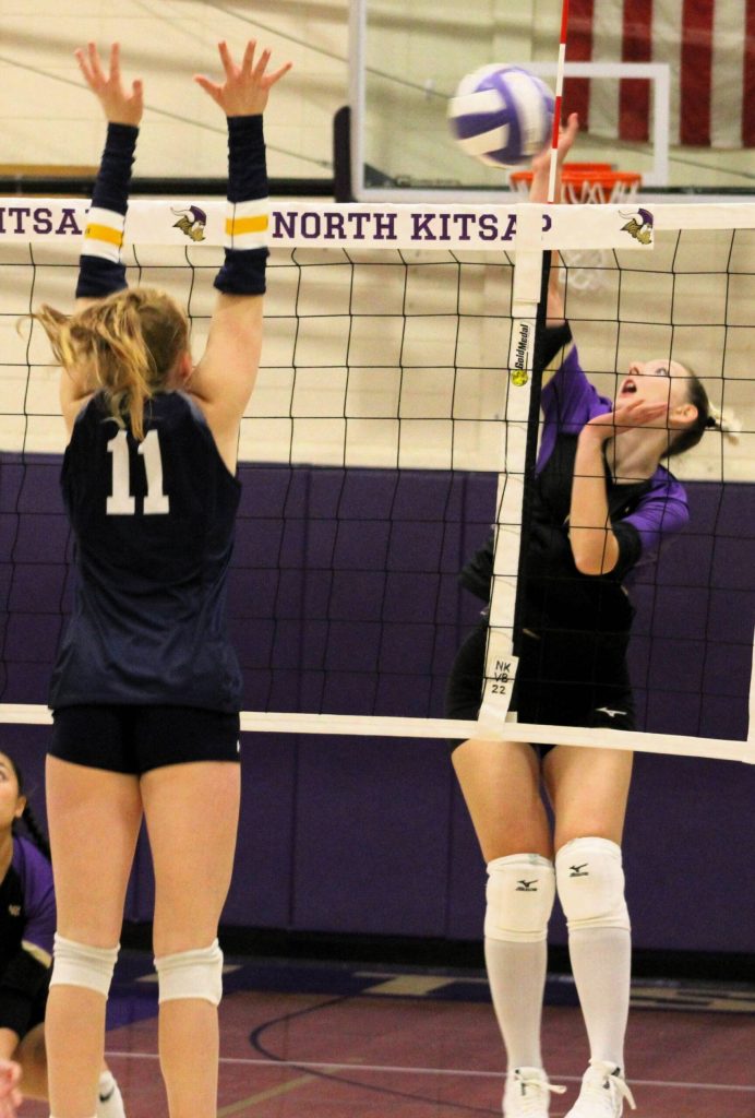 NK senior Teegan DeVries goes up for a two-handed attack at the net.