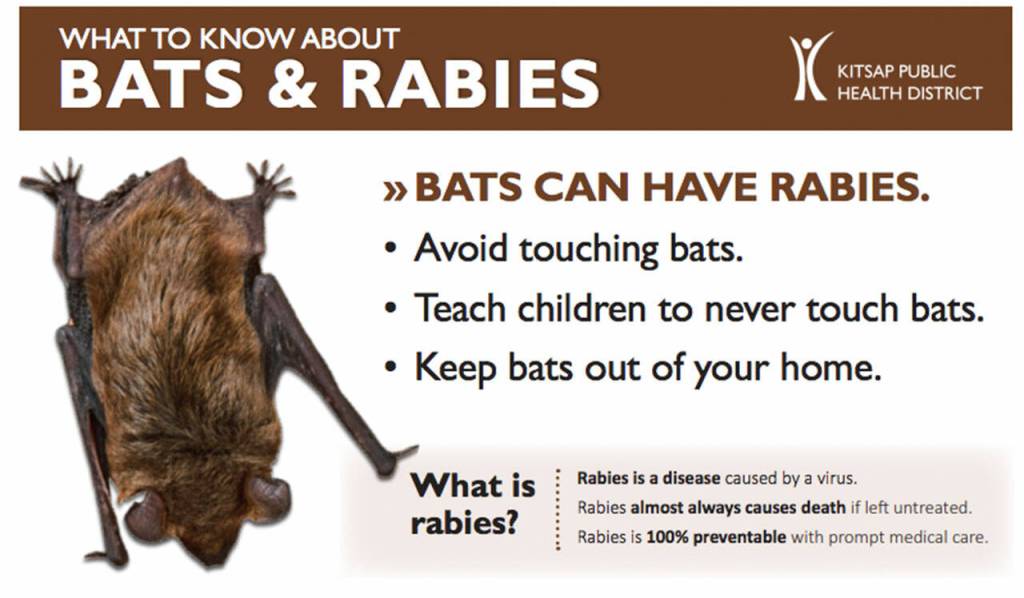 Only a small percentage of bats carry rabies, but rabid bats are reported in Washington every year. Seven bats from Kitsap have been tested for rabies in 2024, with one positive result. Take these same precautions if you are unsure if a person touched a bat (for example, if you find a bat in a room where a person was sleeping or in a room with a young child).