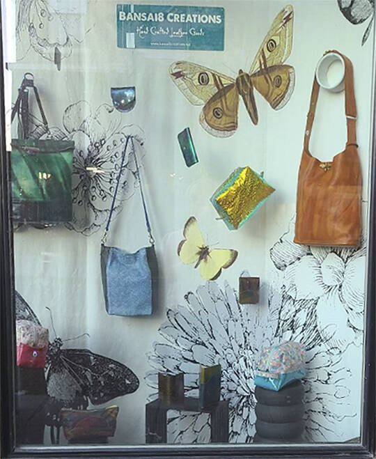 Over two dozen stark windows have been transformed into showcases for those who volunteered their artistic skills. Several displays include conventional artwork, such as paintings. Others, spotlight handcrafted handbags, leatherworks, henna tattoos, vintage typewriters and imaginative announcements of community events like Zine Fest and the Krampus Nacht festival. One window features a framed poem from Tia Hudson, Bremerton’s first poet laureate.