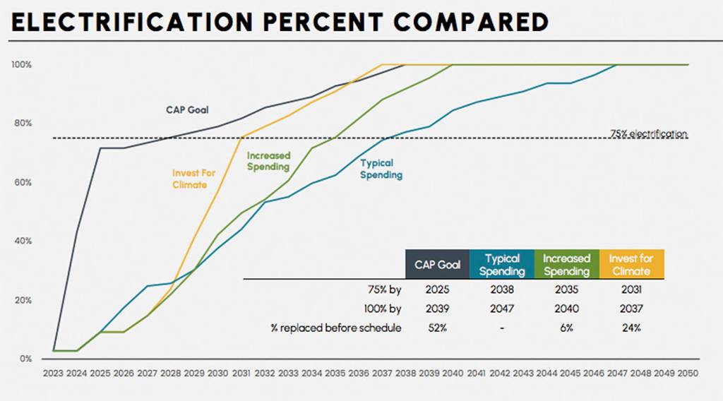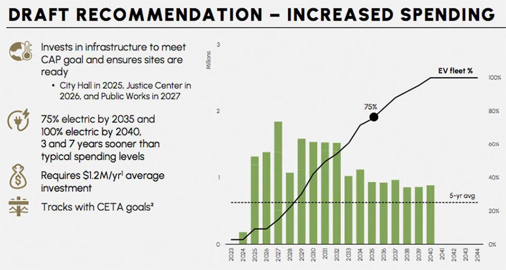 A study to be shown at the City Council meeting shows the 2024 budget at $180,000. One option in the study says $10 million would need to be spent to reach 100% electrification by 2038.