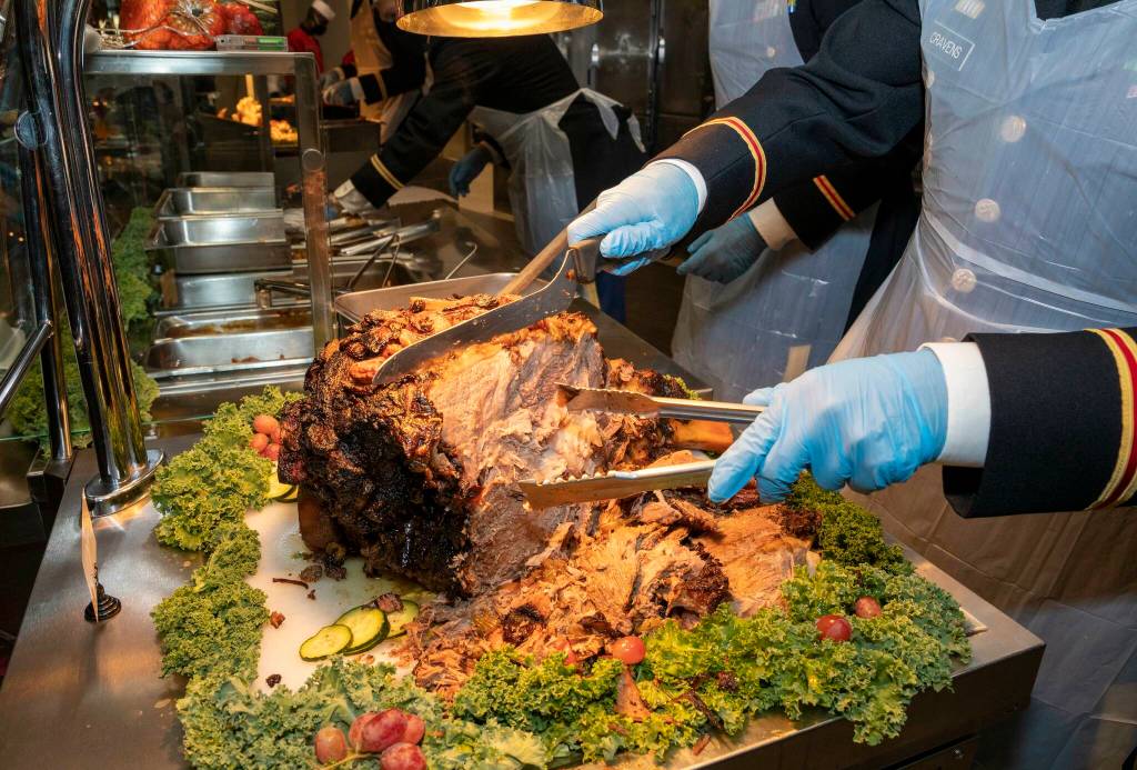 Thanksgiving Dinner at “one of the best galleys in the Navy” will include three mains — a round roast, turkey and a glazed ham — and all the classic sides. Dinner costs $11.40 per person and $8.45 for E1-E4 spouses and dependents.