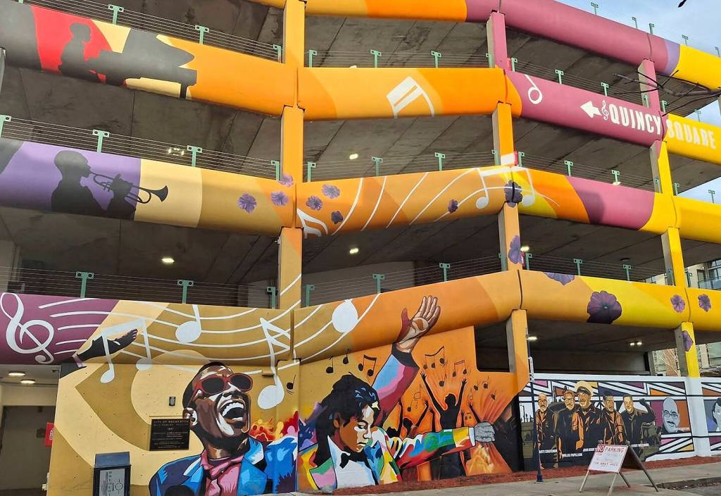 As construction gets under way, a mural on a parking garage is the most obvious sign of Quincy Square.