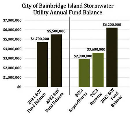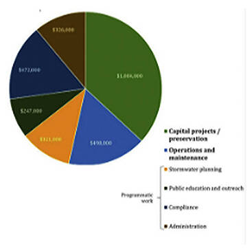 Another slide says stormwater income typically exceeds expenses; spending in 2023 was $2.9 million, and expenses are split 50-50 between projects and programs. As for the future, goals are to prioritize maintenance and preservation of the existing system and to build capacity. Adding staff and funding also are priorities.