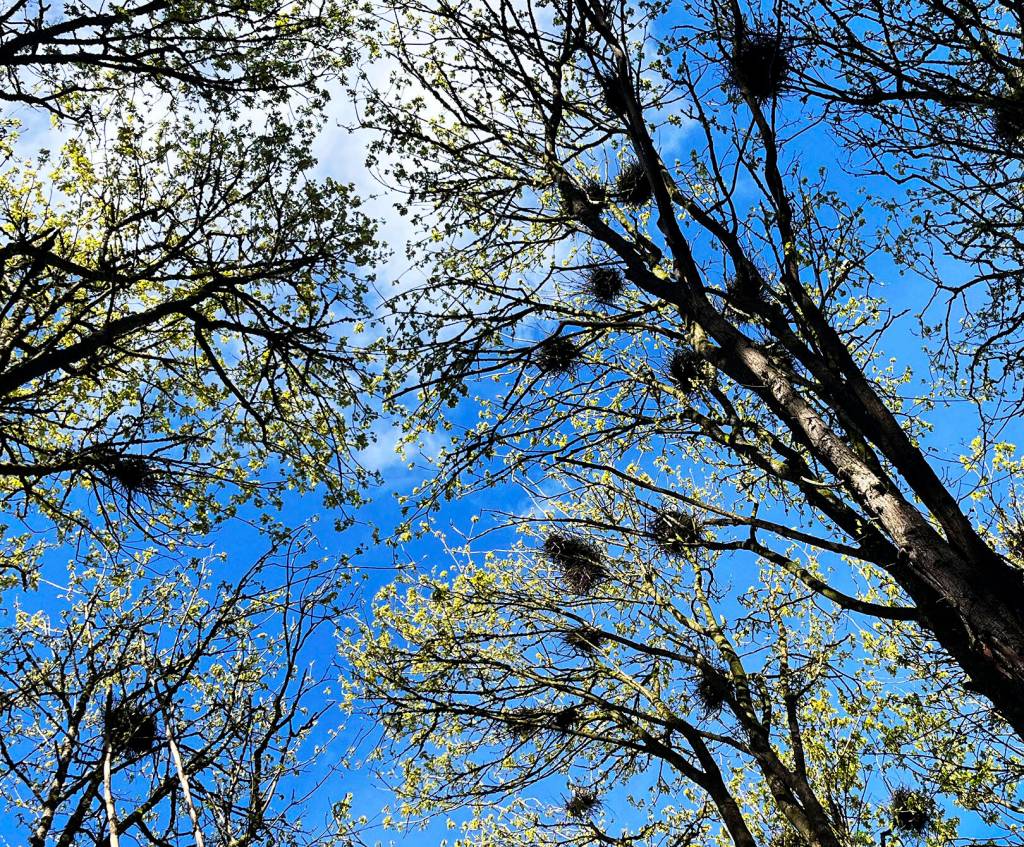 The nests in the rookery, as seen from below in 2024. About 30 nests make up the colony.