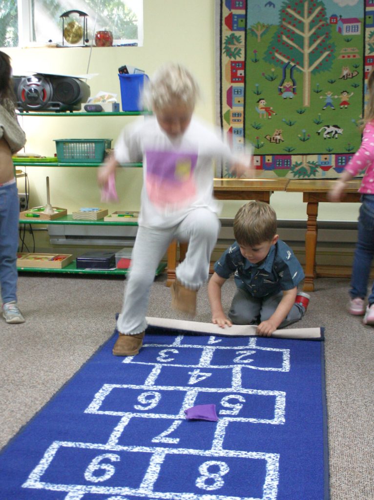 Students take turns playing hopscotch at Leaps and Bounds preschool.