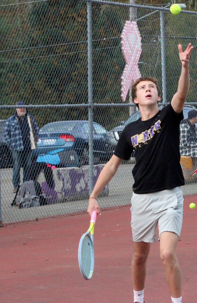 Viking Grady DeVries (serving) and his partner Rocco Targett won the doubles championship at the Olympic League boys’ tennis tournament Oct. 23 at North Kitsap High School.