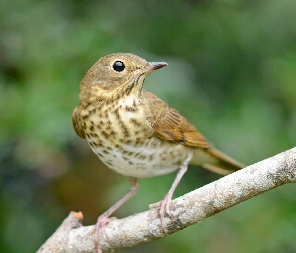 A Swainson’s thrush perched on a branch in Western Washington.