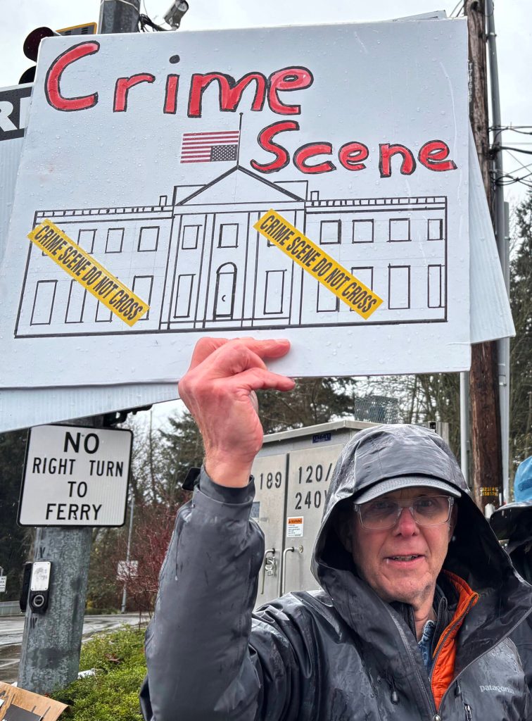 Pam Keeley, Gorbman’s partner and fellow activist, explained that the pair had been rallying in support of democracy at Poulsbo’s Waterfront Park every Sunday for about a year. They began by doing some community organizing — hosting book readings and showing videos “to anticipate what was coming,” Keeley said.