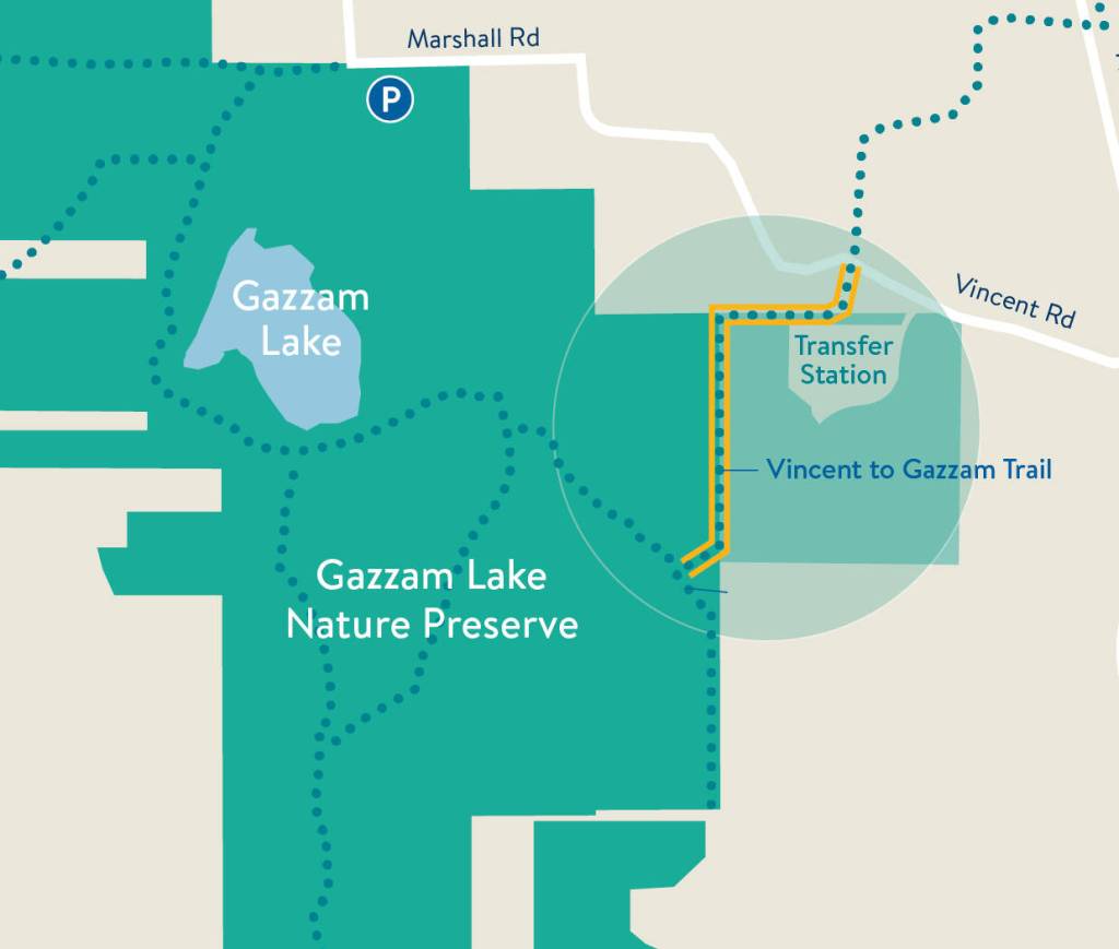 A new route into the Gazzam Lake Nature Preserve, and a segment of a landmark trails project, is now open: a brand-new path that connects to the Opal Ridge Trail from NE Vincent Road.