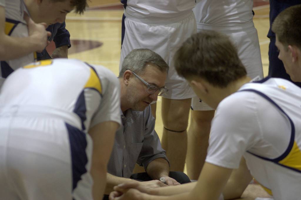 Spartan head coach Scott Orness draws up plays during a timeout in a 72-48 Bainbridge loss to Foster in the opening round of the 2A boys state basketball tournament Feb. 28 at the University of Puget Sound in Tacoma.
