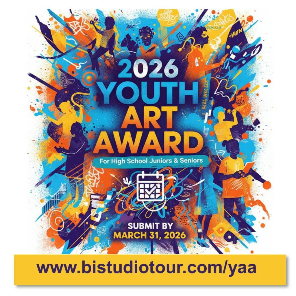 The deadline is March 31. Applications can be found online at the Studio Tour website: www.bistudiotour.com/yaa. Students will need to supply an artist’s statement and five photos of their work electronically. All types of visual art are eligible – paintings, drawings, pottery, sculpture, glass, photography, etc.