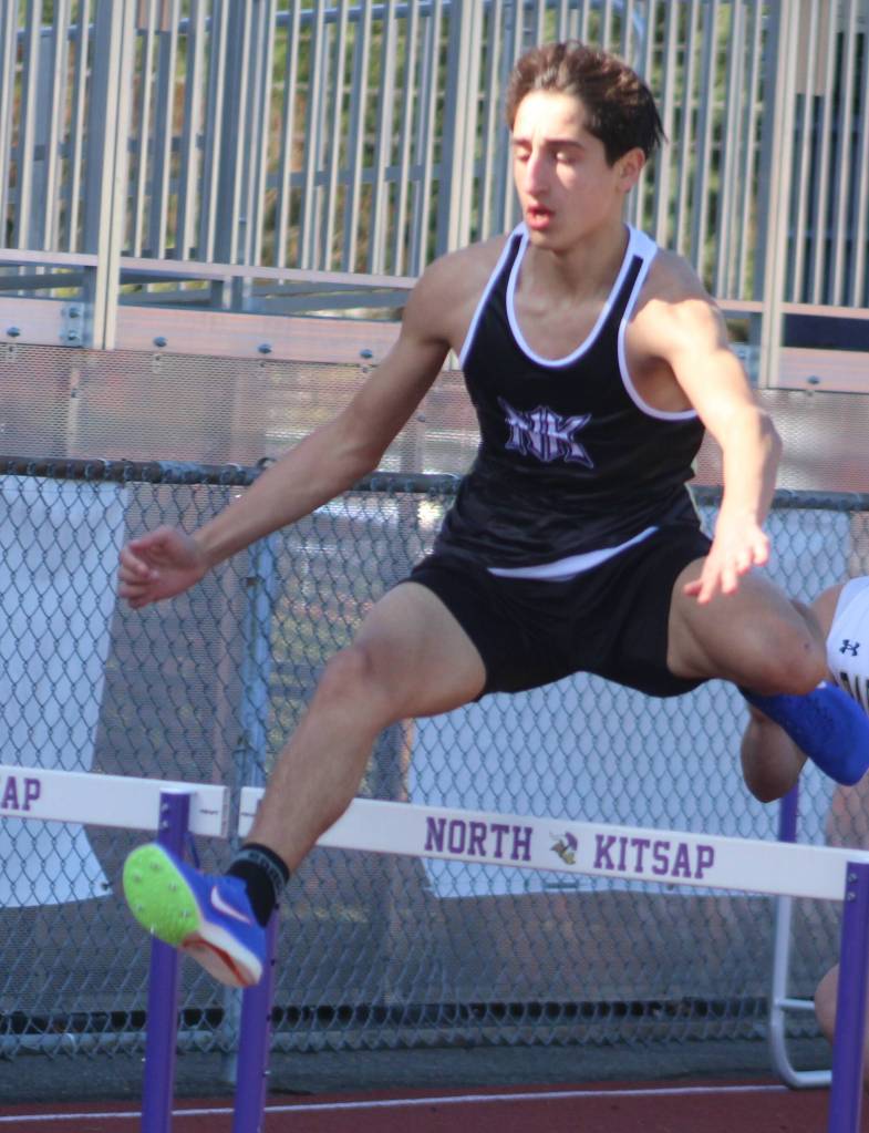 Viking Edmond Sargsyan competes in the boys 110-meter hurdles in a track and field meet at North Kitsap High School March 26.