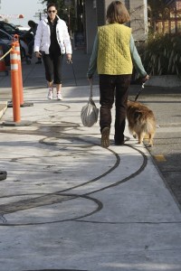 The new “art integration” sidewalk areas on the south side of Winslow Way were more slippery than expected…