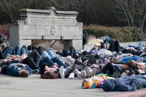 One student sneaks a snack during the “die-in” at Bainbridge High School Wednesday morning.