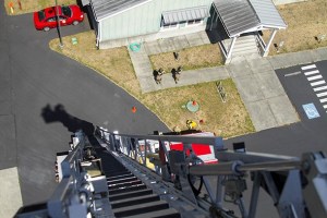 The view from the top: 100 feet above the ground in the extendable ladder during recent Bainbridge Island Fire Department drills.