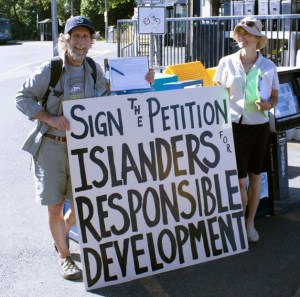 Organizer Ron Peltier collects signatures at the ferry terminal for a petition opposing the proposed retail center on the corner of Highway 305 and  High School Road with fellow protestor Tami Meader.