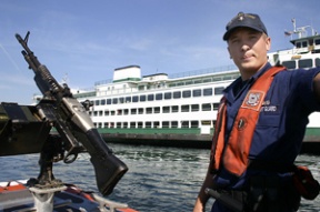 Coast Guard boatswain's mate Kain Foglesong stands at the bow of his patrol boat during an escort of the ferry Hyak across Puget Sound this week.