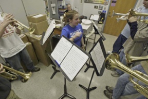 Maddy Walentiny of the trumpet section leads sectional practice in BHS band assistant David Johnson’s office. Because of lack of space