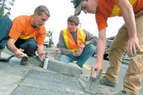 Lorenz Eber (center) inspects work on new pedestrian islands this week.