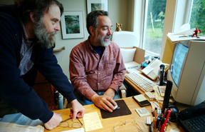 Long-time friends Jerry George and Bob Haslanger navigate the web site they created. The innovative duo have helped pioneer computer networking and sales on Bainbridge.