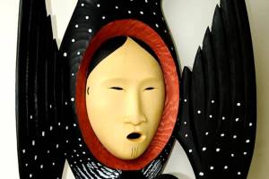 Photo courtesy of Roby King Galleries                                Suquamish artist Larry “Ulaaq” Ahvakana’s “Female Loon Spirit Mask.” Red and yellow cedar, acrylic, glass beads.