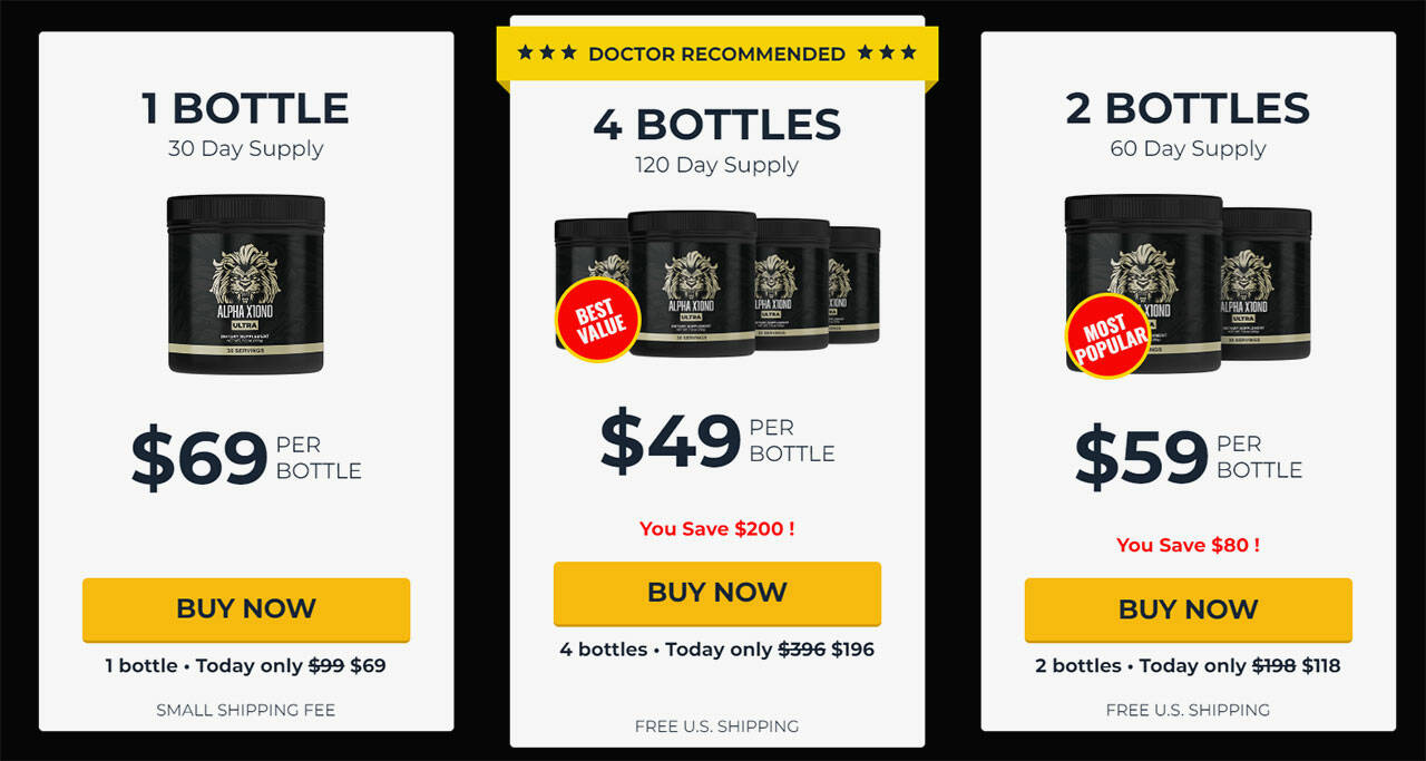 Order the 90-day Alpha X10ND Ultra bundle, and you get this supplement’s full testosterone-enhancing and libido-boosting benefits. Pay $59 each ($177 order total) and save $40 per bottle and $120 total on your order total.