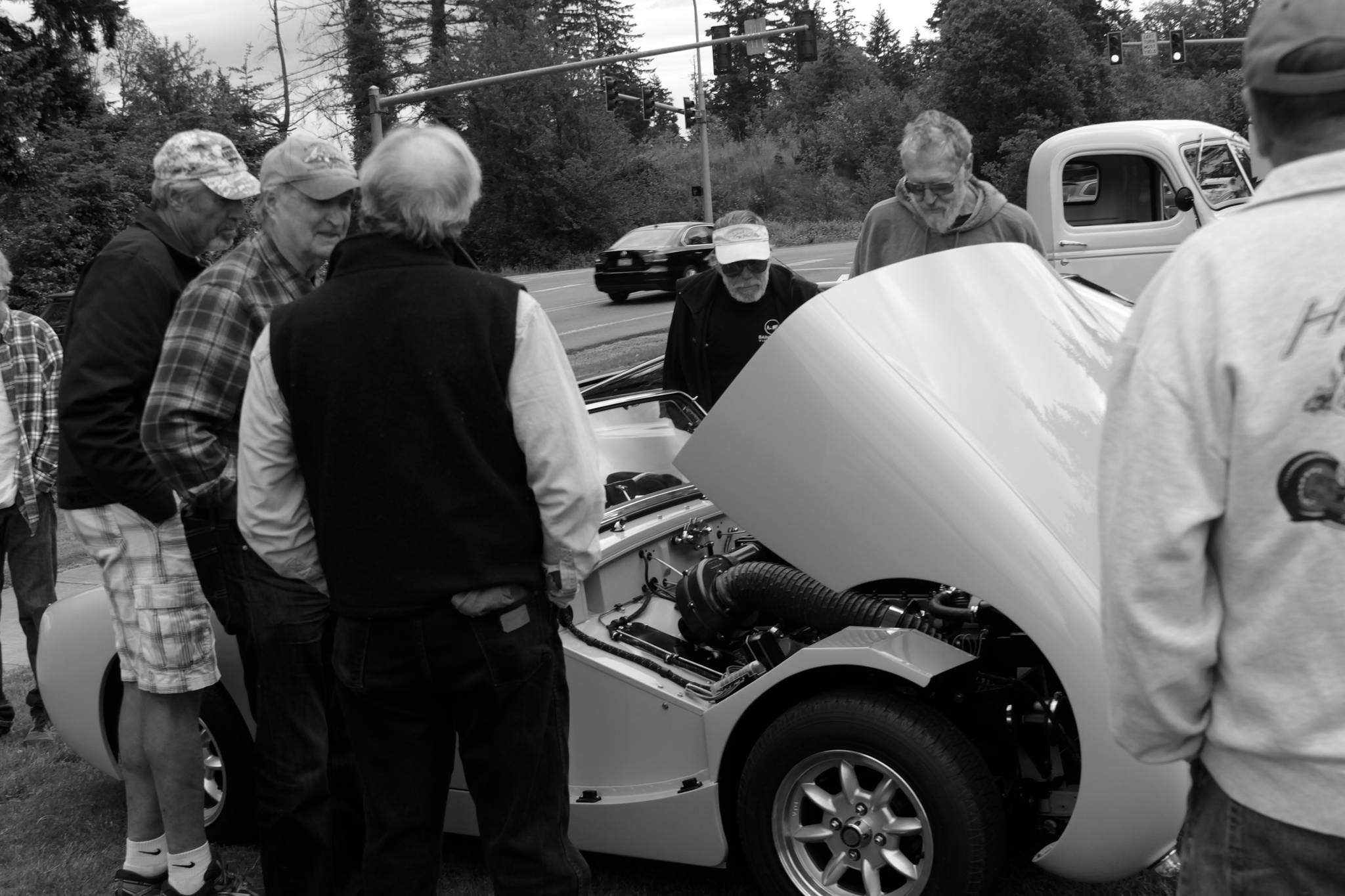 Honks aplenty from passing vehicles the nearby highway greeted the slew of vintage cars arranged at the intersection of Highway 305 and Madison Avenue Tuesday, a surefire sign of summer’s imminent arrival as beloved as early sunrises, the disappearance of parkas, and baseball games on TV: the monthly Bainbridge Island Classic Car Cruise-In.