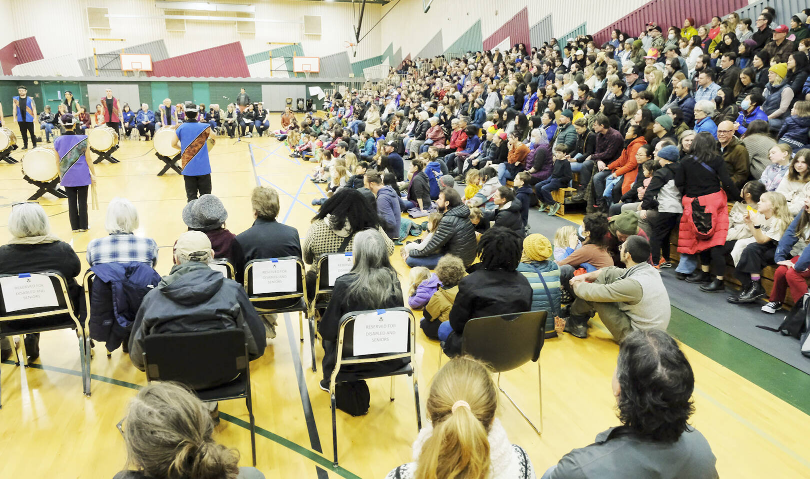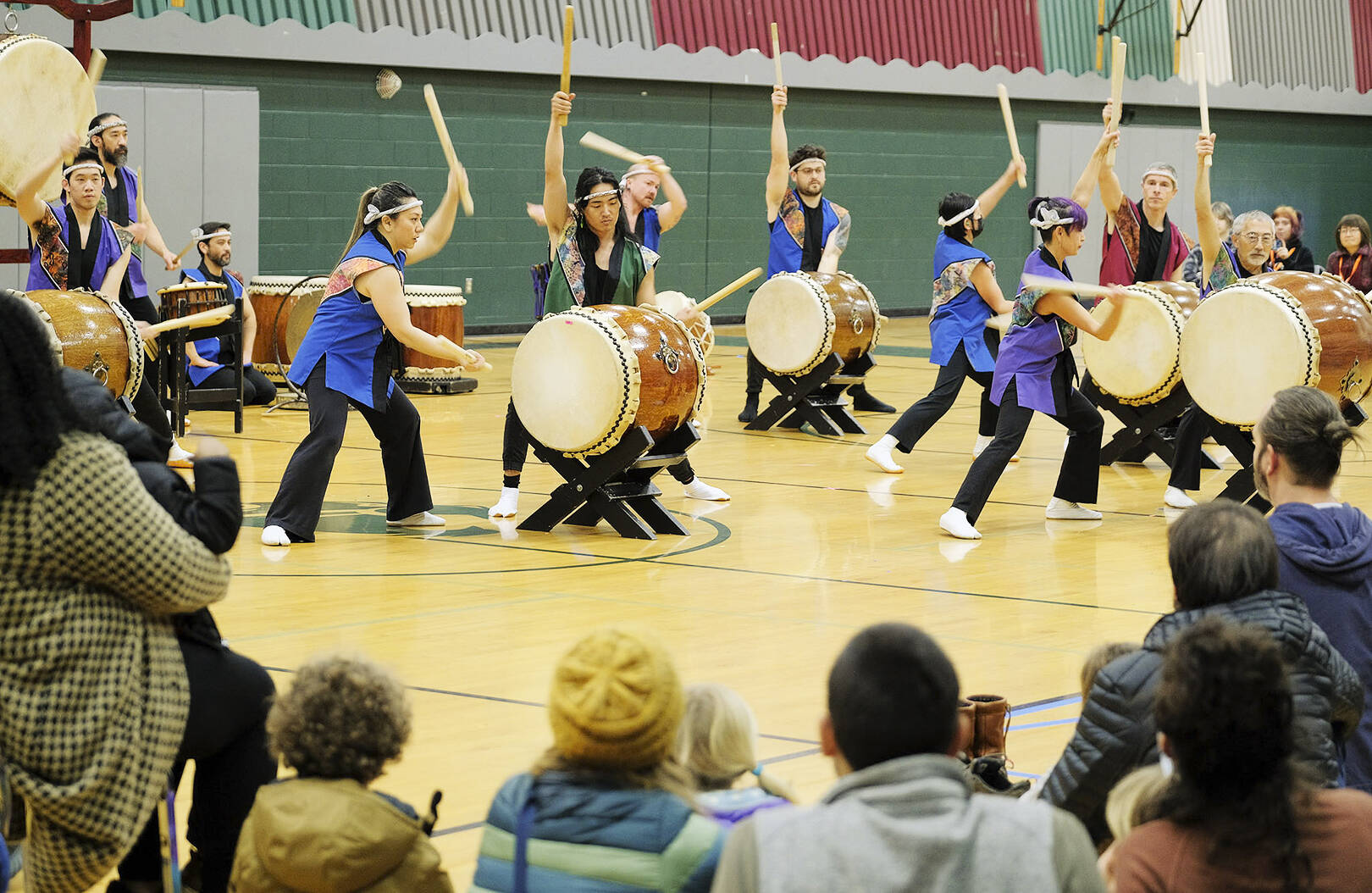 Audience members watch the taiko drummers perform.