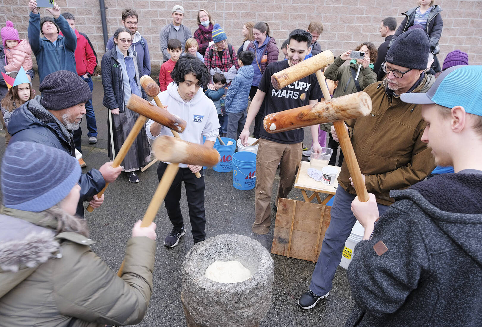 Another hands-on activity was using mallets to mash the mochi dough.